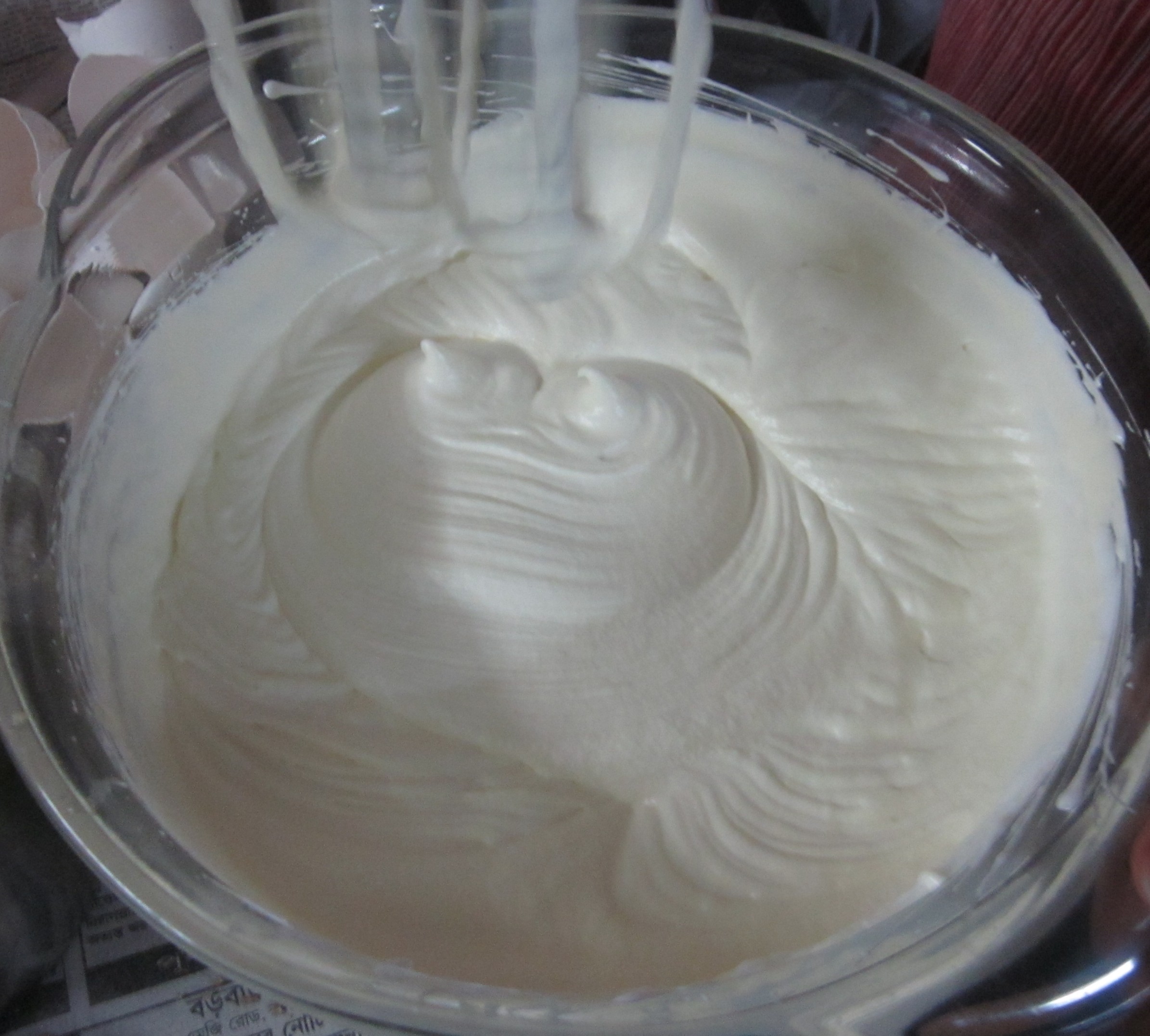 1. Gently mix the egg whites and both the sugars in a bowl. Then place the bowl on a double boiler with simmering water. Whisk well until all the sugar melts, and you have a frothy mixture (about 5 mins). Make sure the double boiler doesn’t get too hot. Keep taking it off the heat and putting it back on so that you have control over the temperature. You don’t want scrambled eggs!