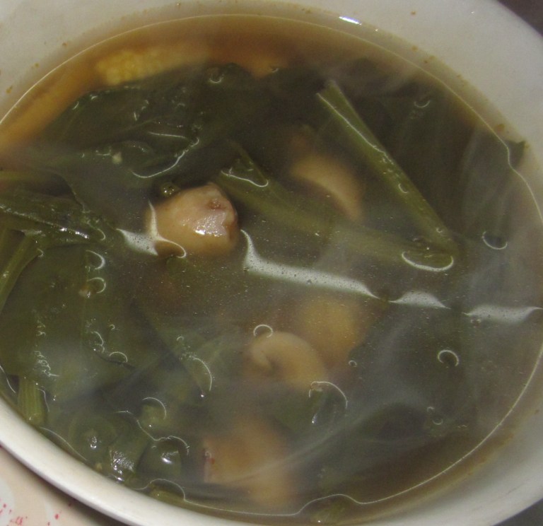 3. Add the mushrooms and cook some more. Wash the spinach, remove the ends of the stalks and add to the soup.