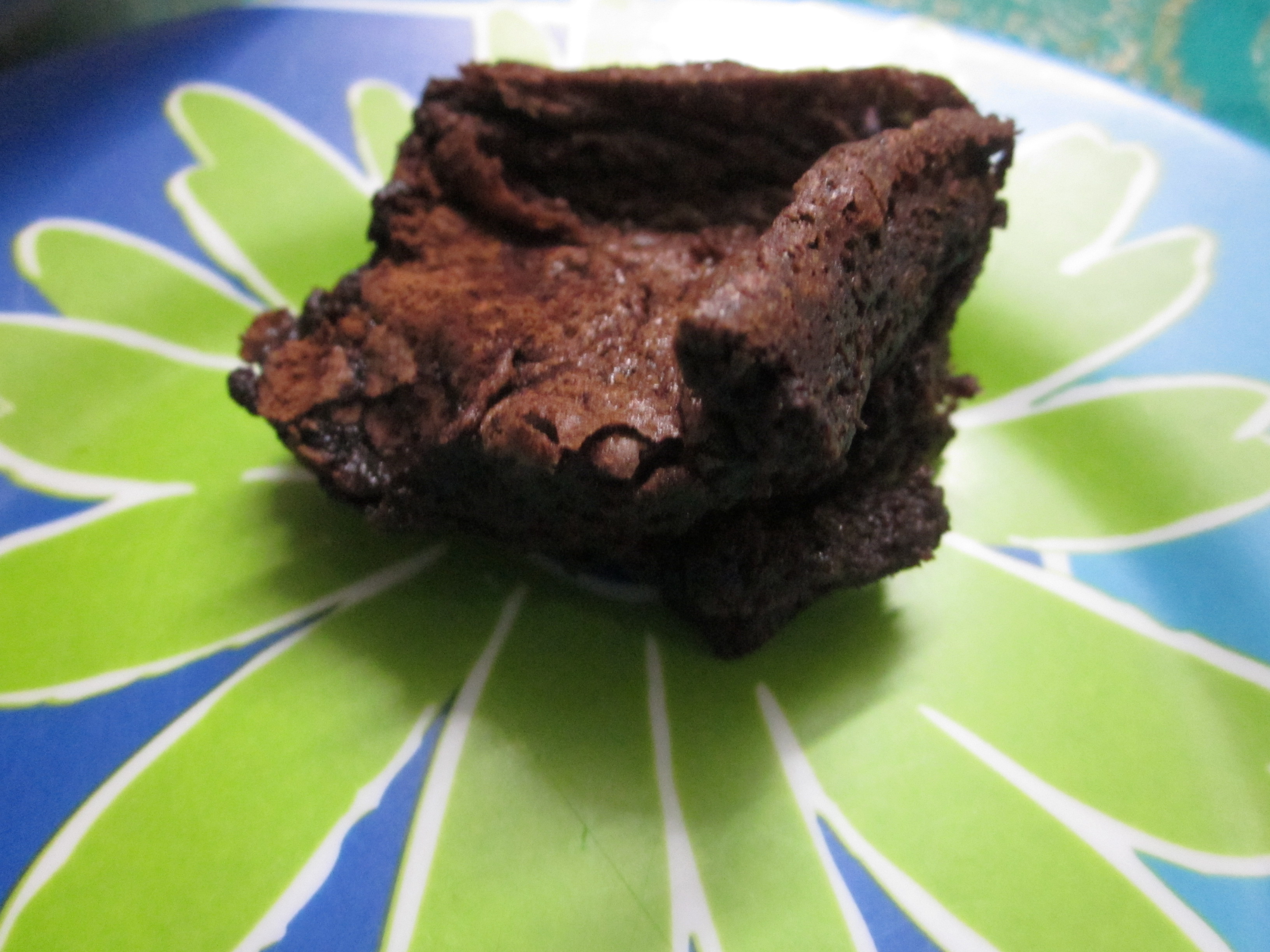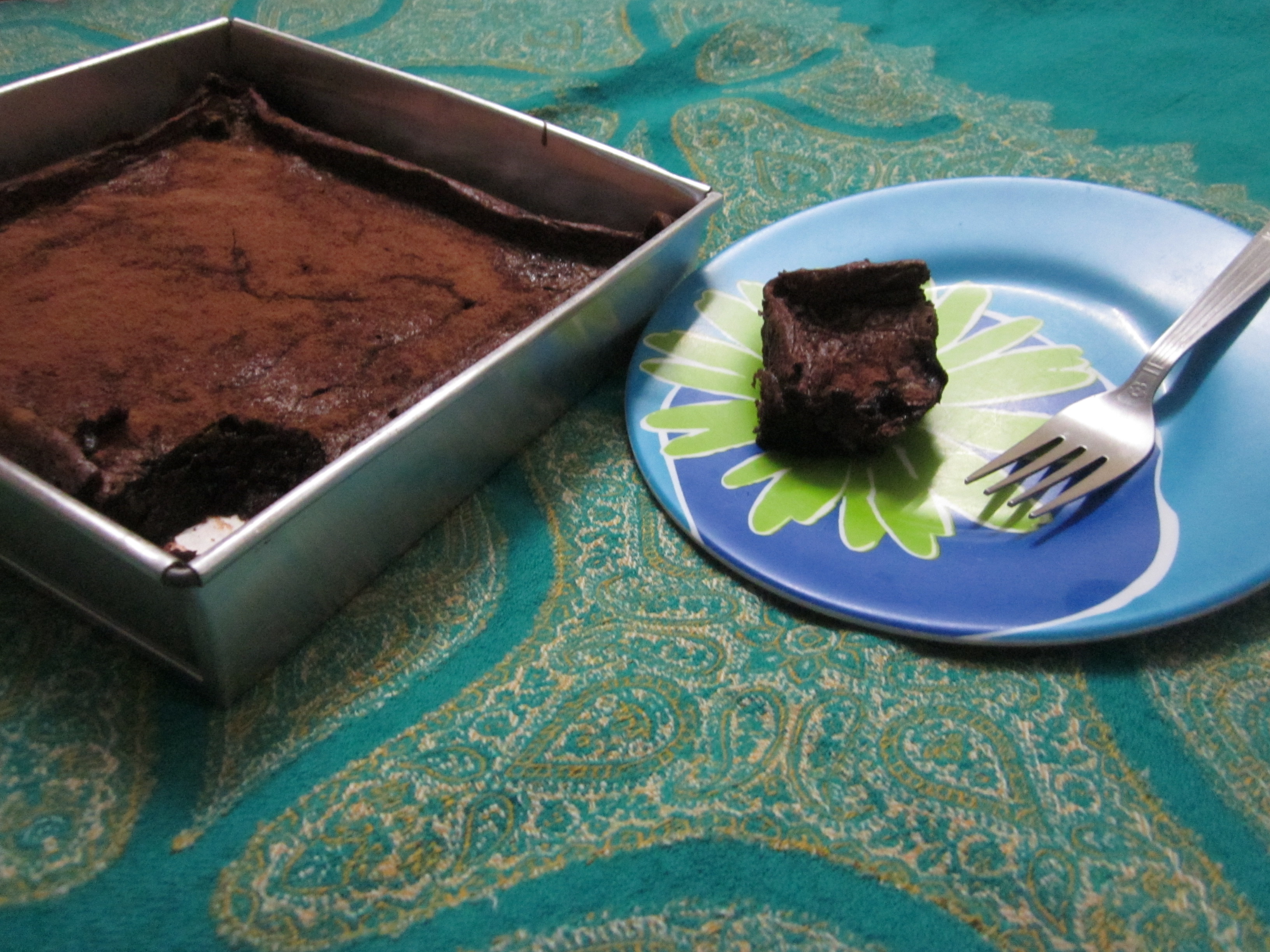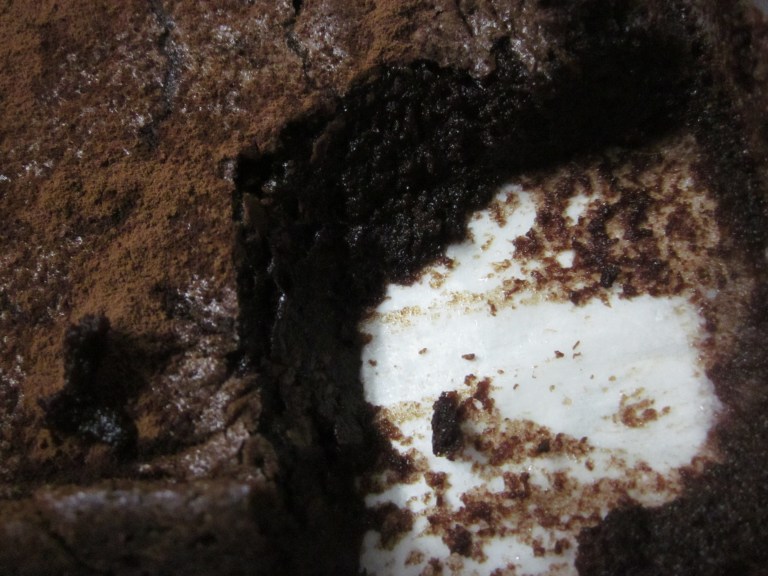 3. Sift in the cocoa, vanilla, and coffee. Mix until everything is incorporated. Line an 8-inch square tin with baking parchment and grease slightly. Pour in the batter and bake in the preheated oven for 22 minutes. Remove and let it cool completely. It will be a bit wobbly when you take it out, but will harden as it cools. Eat plain or with vanilla ice-cream. Tastes even better the next day!