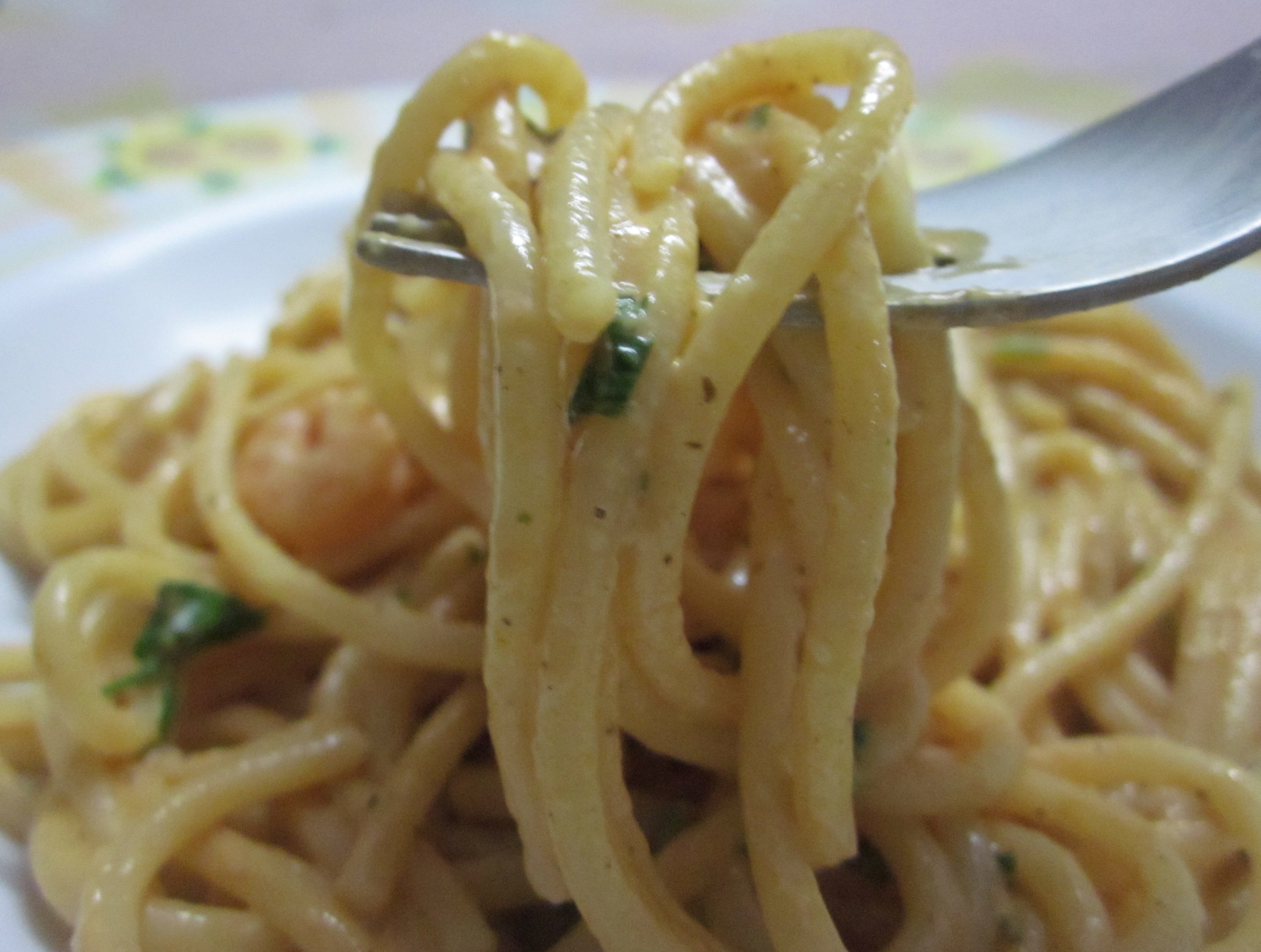 Long, slippery-smooth spaghetti. Each velvety strand coated with a peach-coloured sauce.