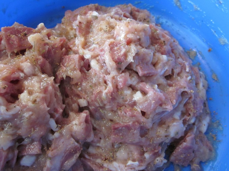Step 5– Mix the meats. Here I’ve used chicken, pork, and ham. Say with me: there is no such thing as too much meat. Or chocolate. Eat another piece. It’ll give you the energy burst you need to keep going.