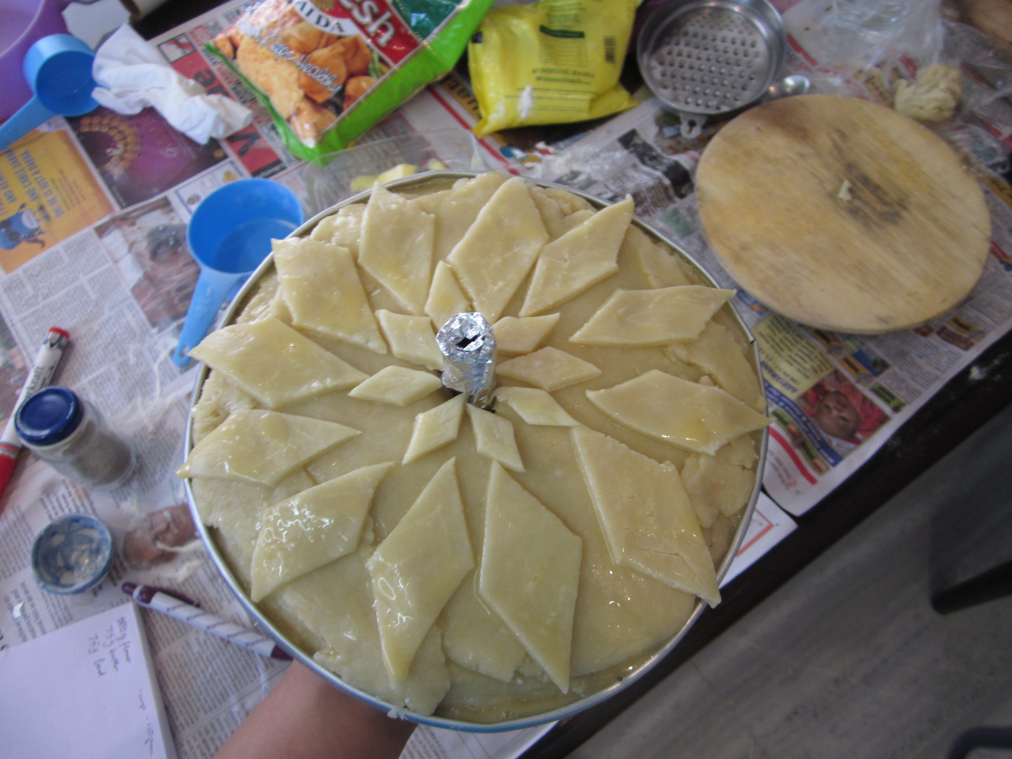 Step 7– Cover the pie with a top layer of pastry. Cover any untidy bits with pretty pastry leaves. Add a foil chimney so the insides cook. Also tidy up a bit. Look how messy the table is!