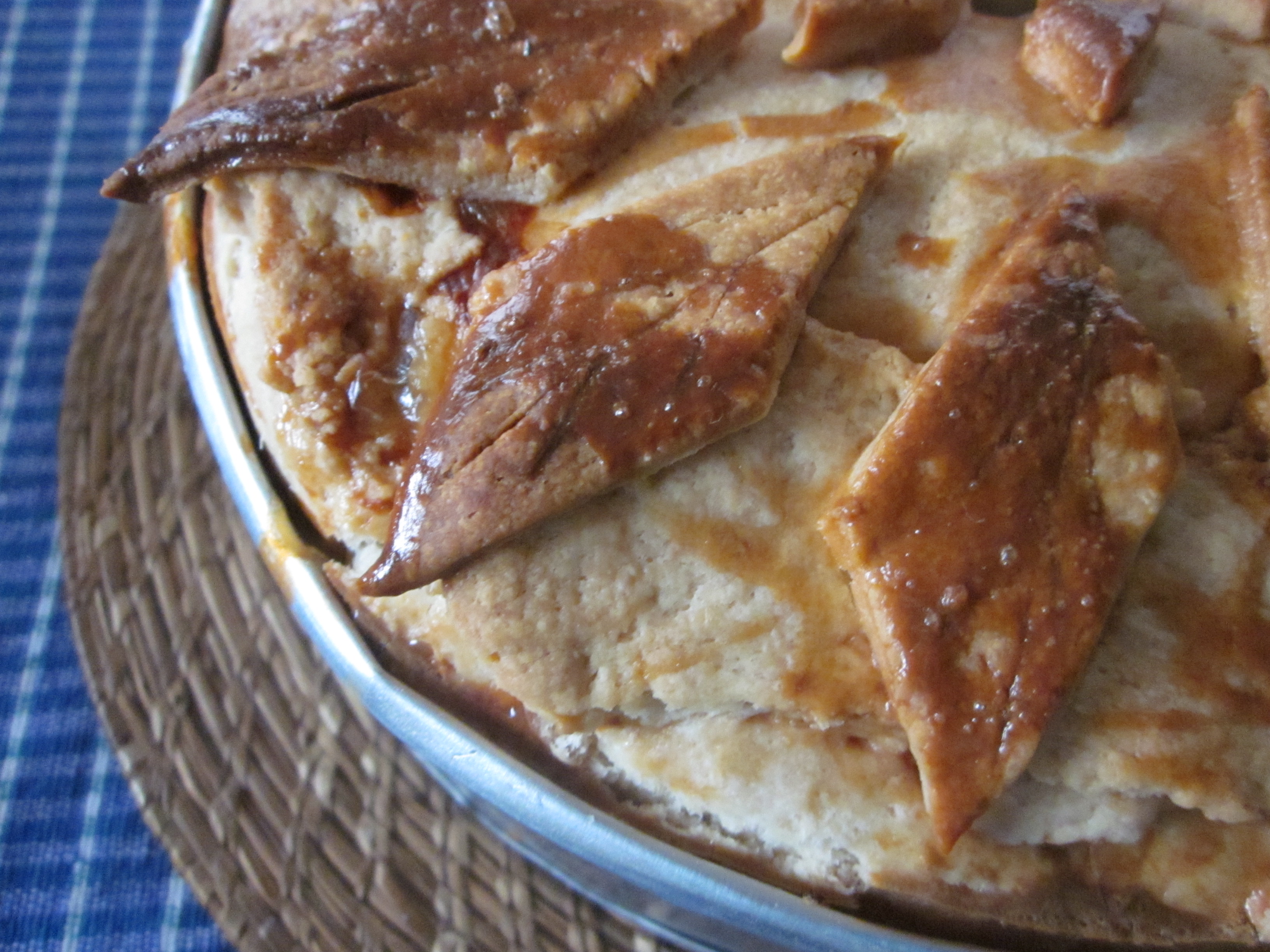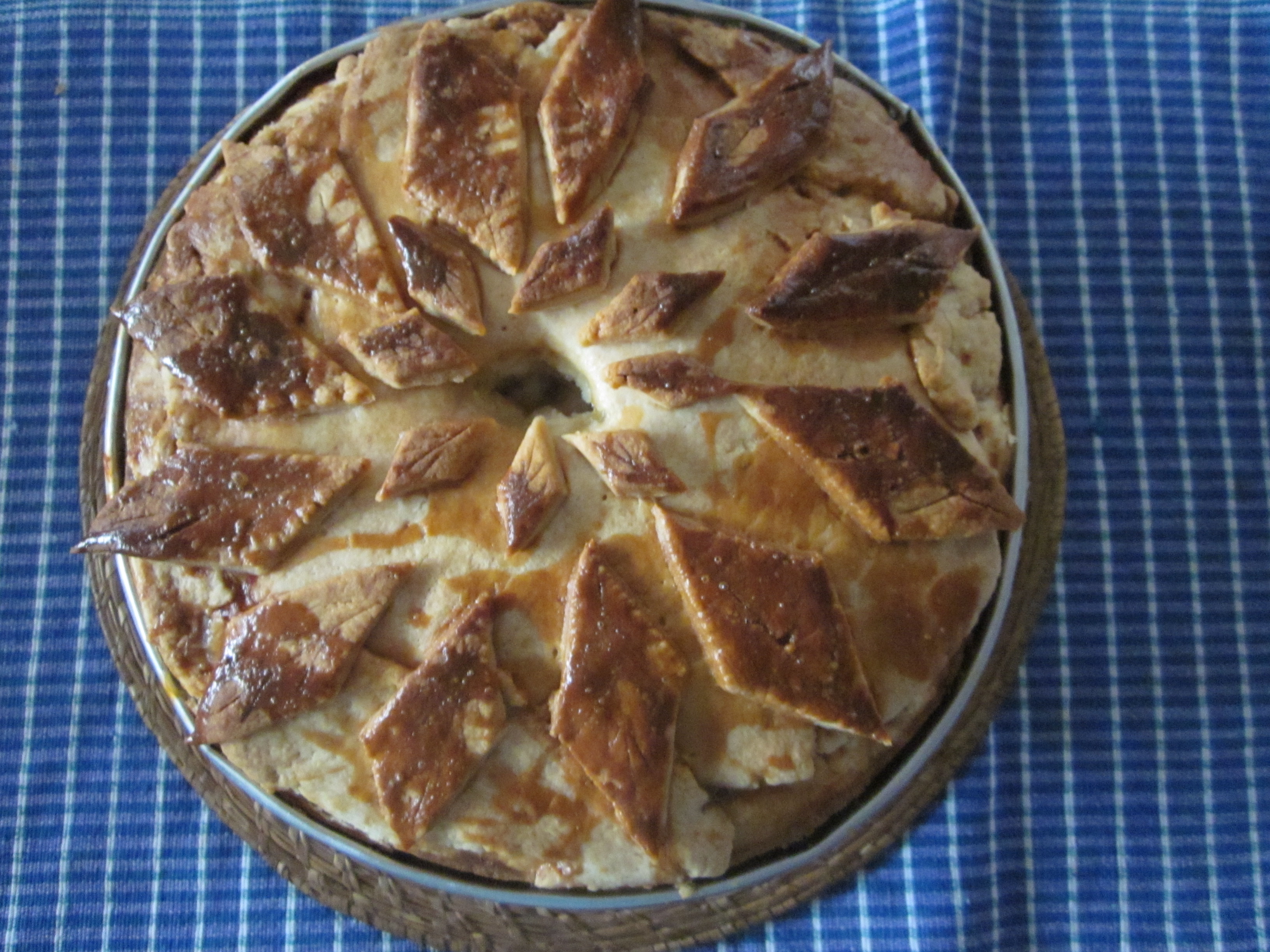 4. Roll out the remaining dough and cover the top of the pie with it. With the extra bits of dough, carve out diamond shapes and mark veins in them with a knife. Arrange these all over the pie and brush with the egg glaze.