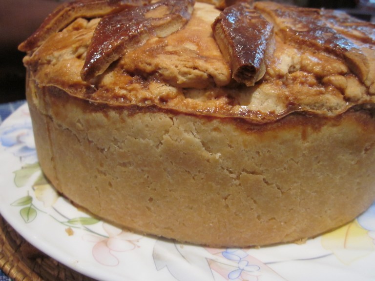 5. Make a chimney with some foil and insert it in the middle of the pie. Bake in the pre-heated oven for about 1 hour. Then reduce the heat to 180º C, remove the foil chimney and bake for another 30 minutes. Let it cool slightly before removing from the tin. Slice and serve.
