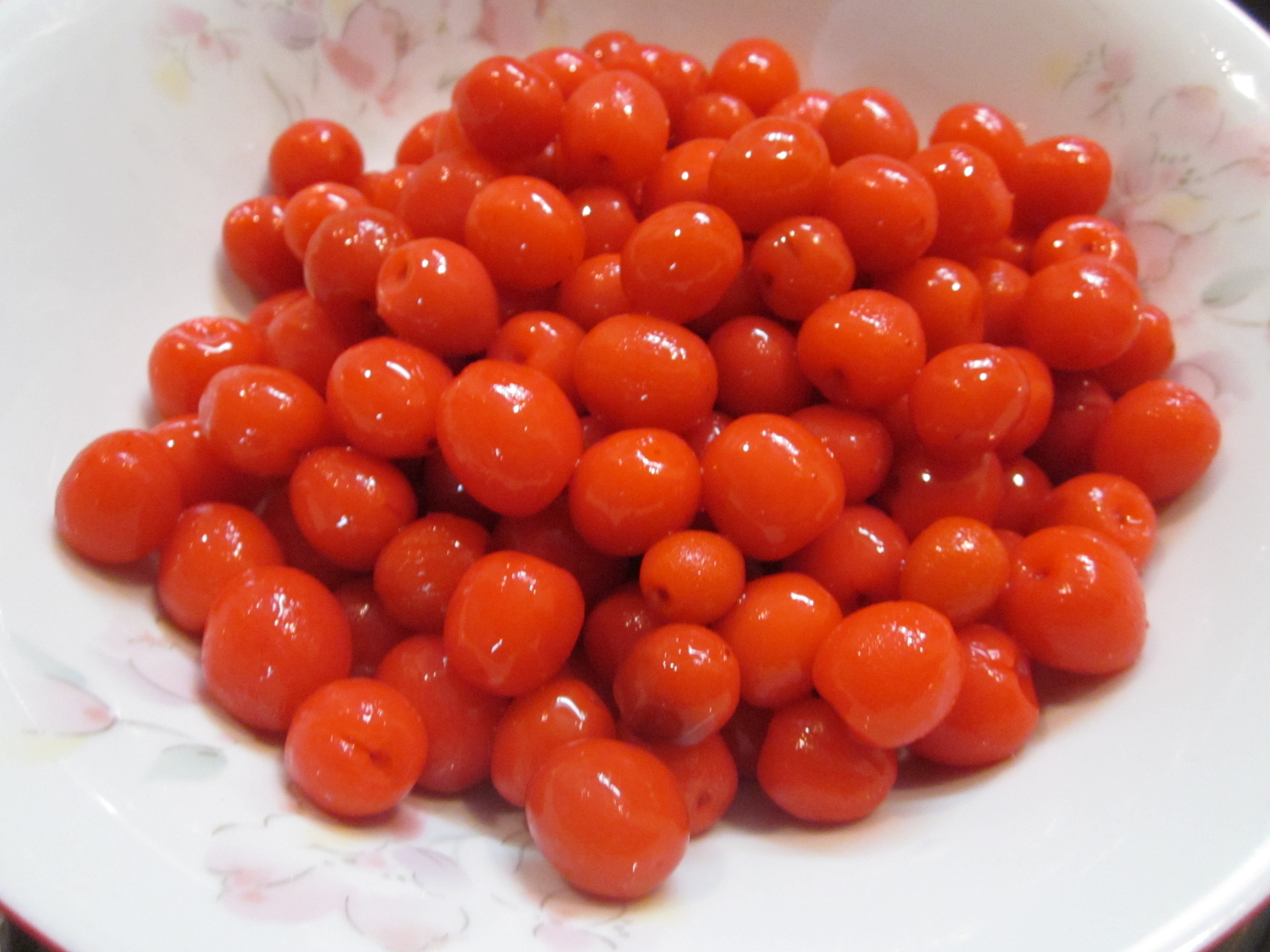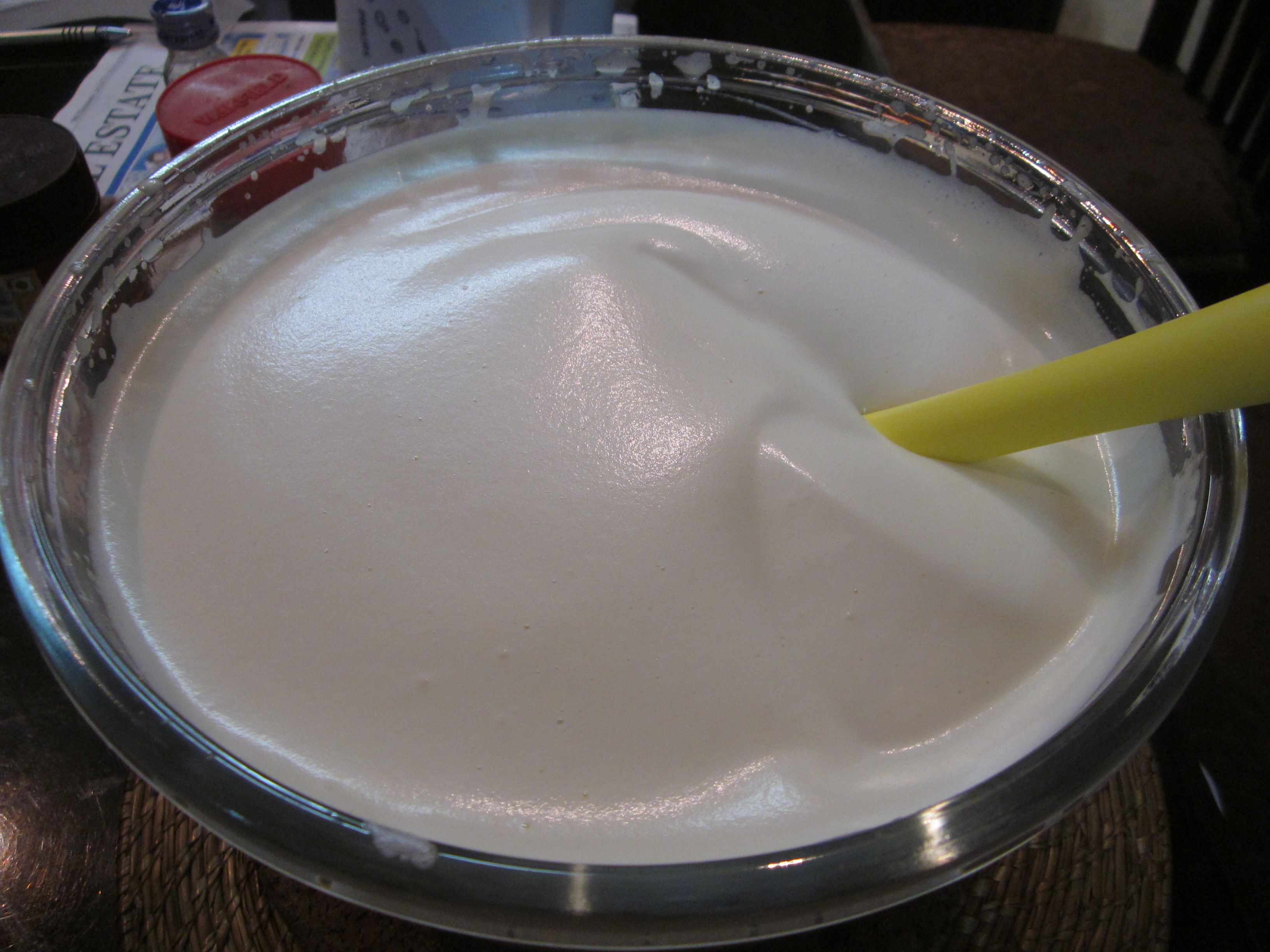 Whip the cream to soft peaks. Now it’s time to assemble the cake. Put the first layer down gently on the serving platter and cover the top with cream (all of it save a little) and the cherries (save some of the best cherries for the top of the cake). Top with the second layer of cake.