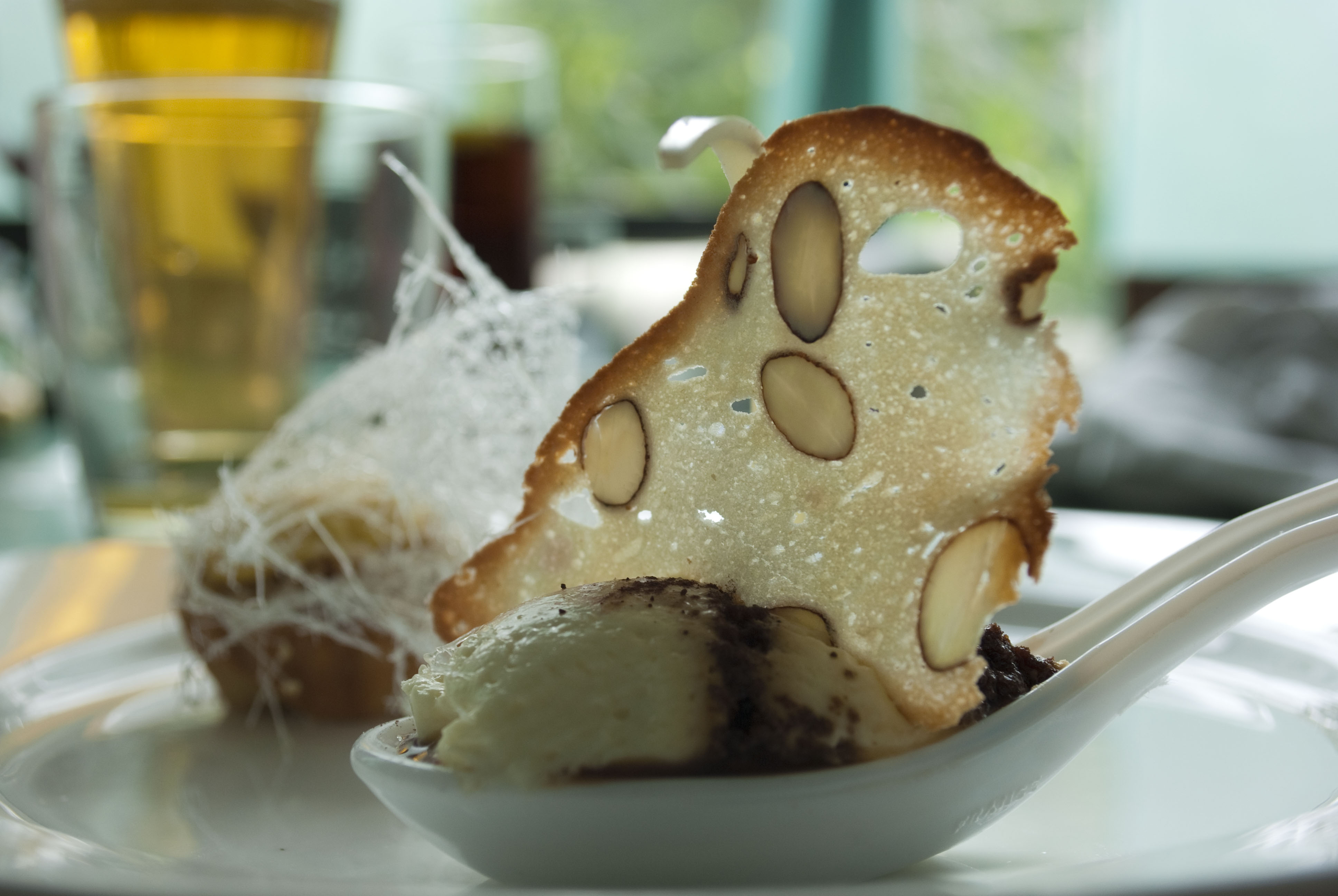 He then demonstrated a lovely fried asparagus and fried basa in Olive Pomace Oil. The batter was made frothy and light with a nitrogen infusion. Here he’s showing us how to do it.