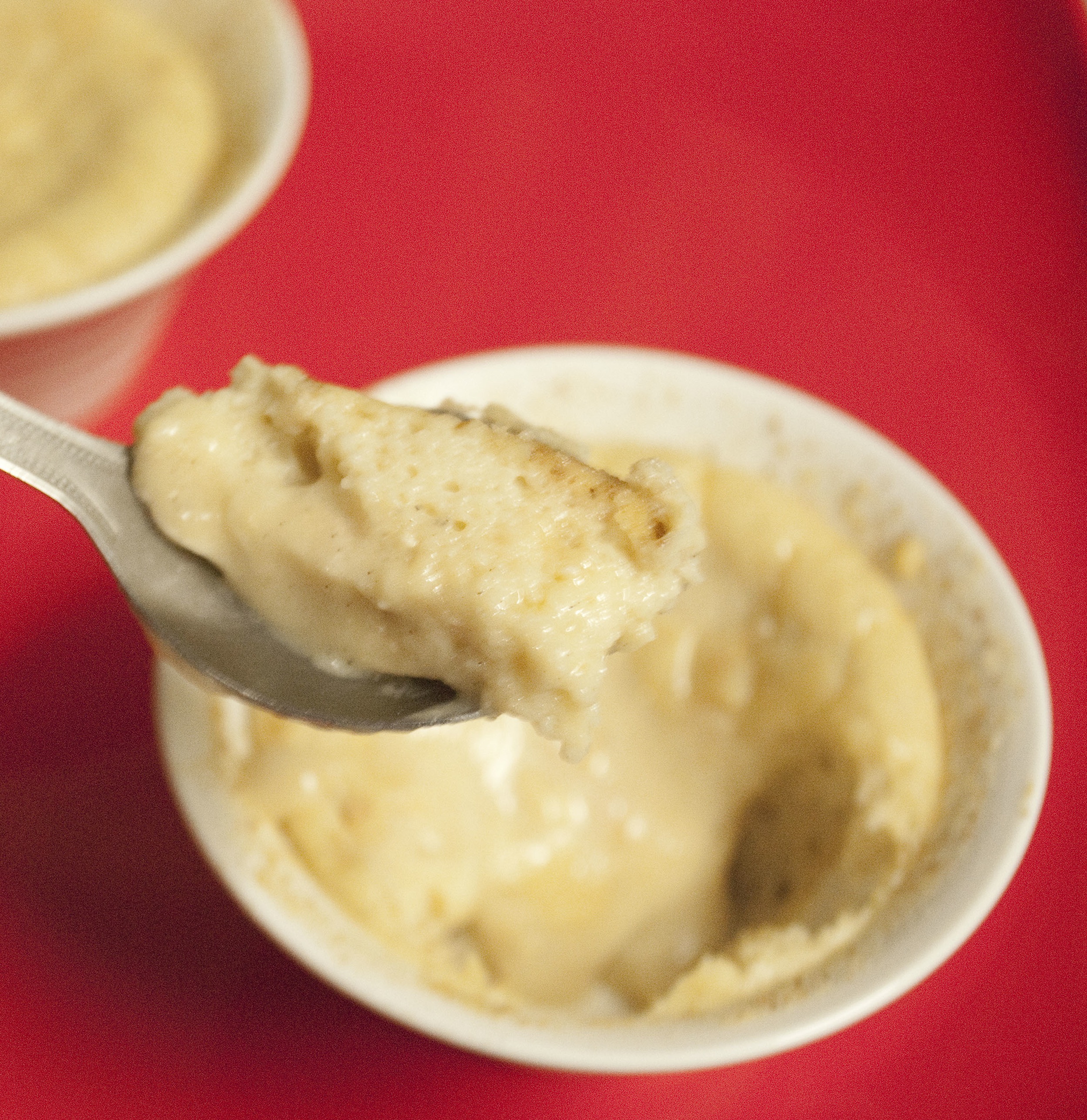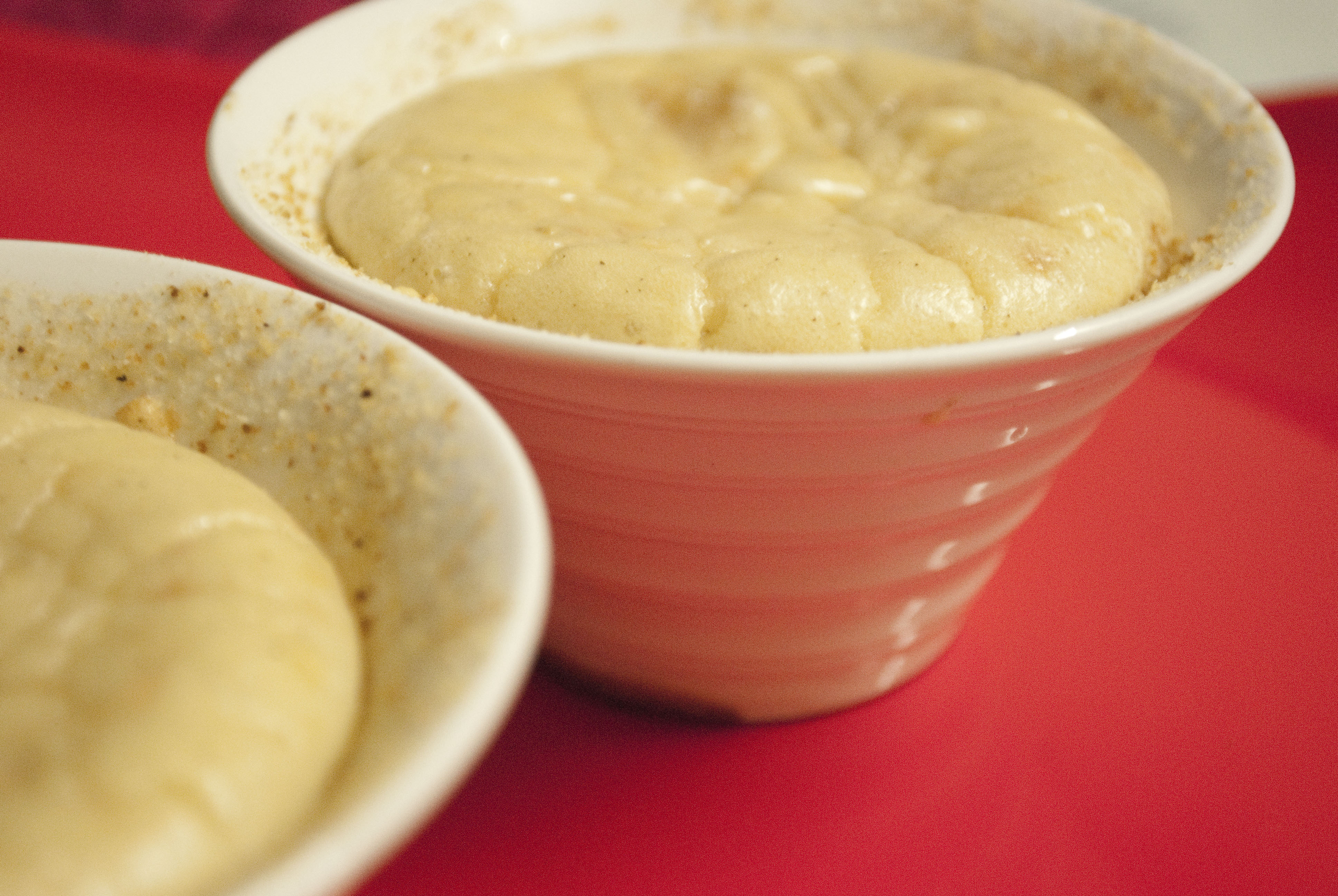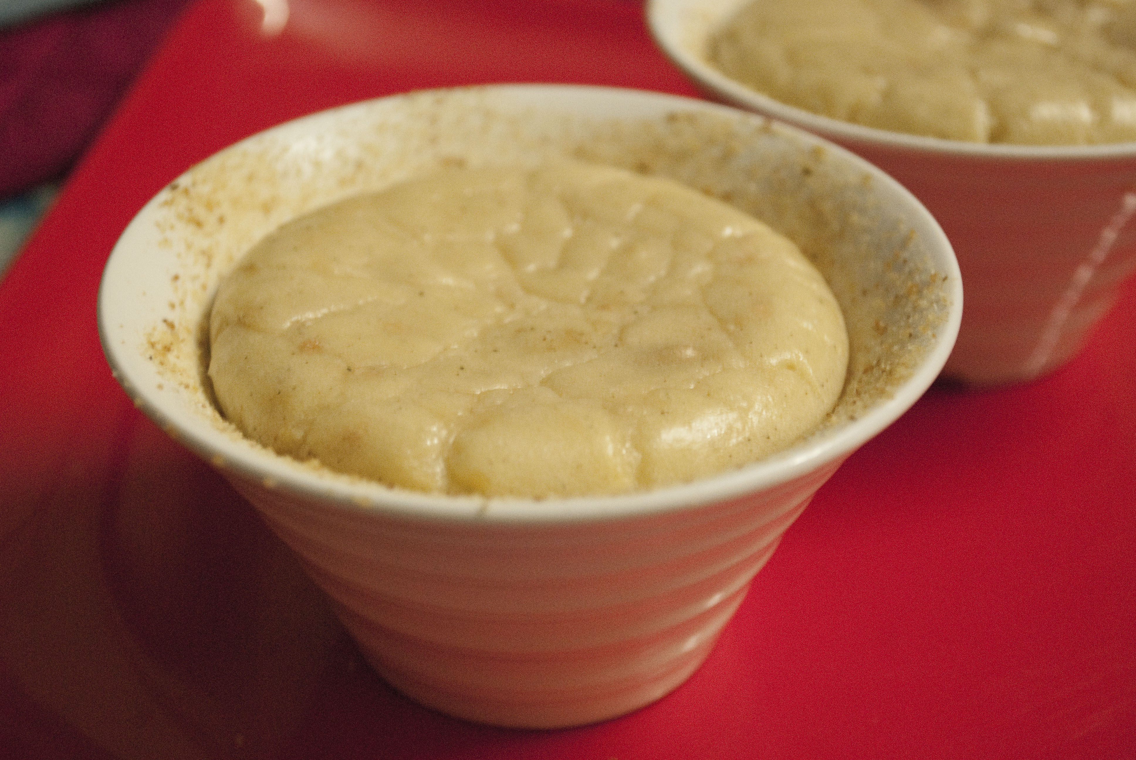 5. Spoon into the ramekins, filling each about two-thirds full. Create a “top-hat” by running a blunt knife around the edge of the mixture, all around the inside edge of each ramekin. Place them on a baking tray and bake for about 18 mins. Remove and eat immediately.