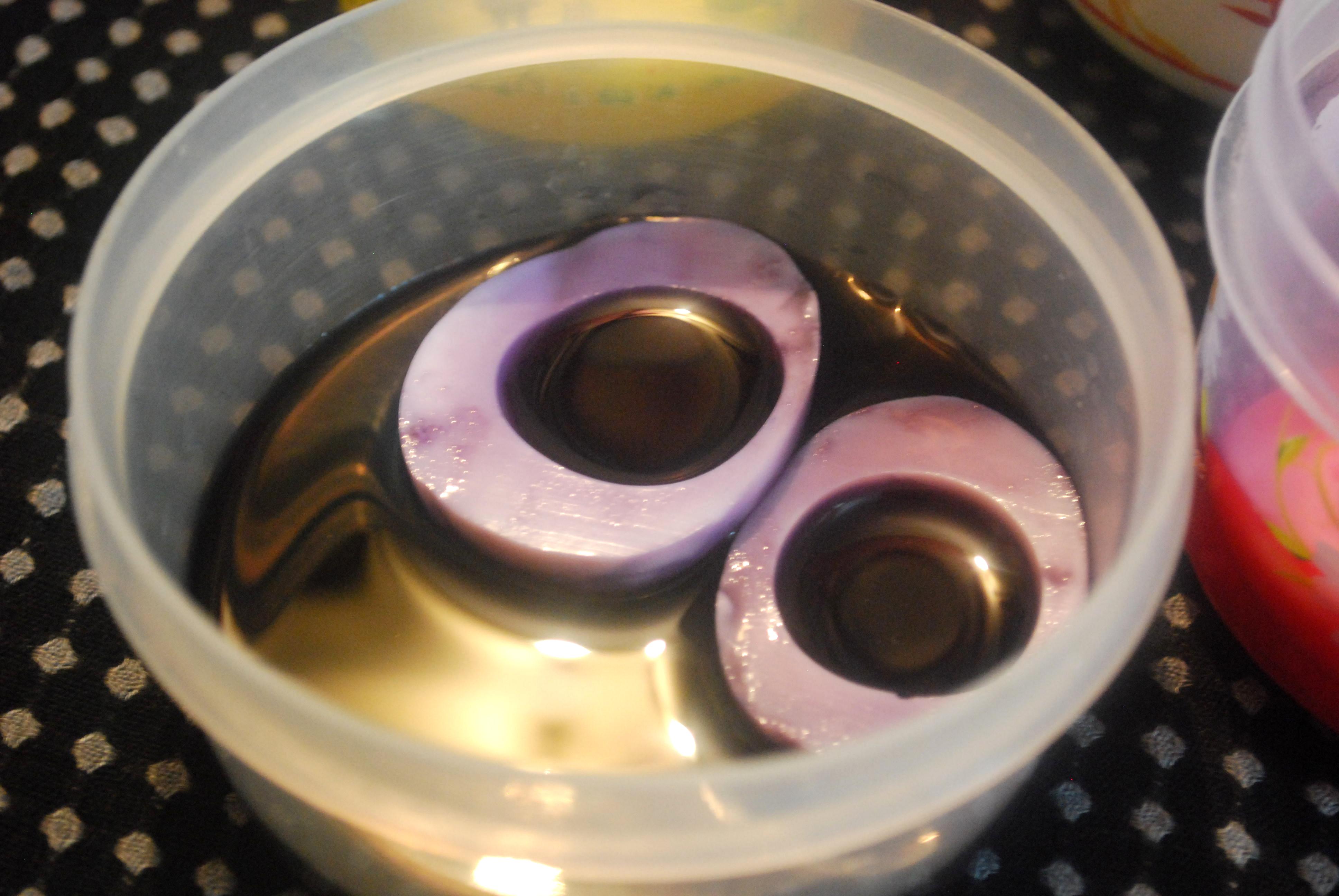 All you have to do is soak hard-boiled egg-white halves in any food colour you want.