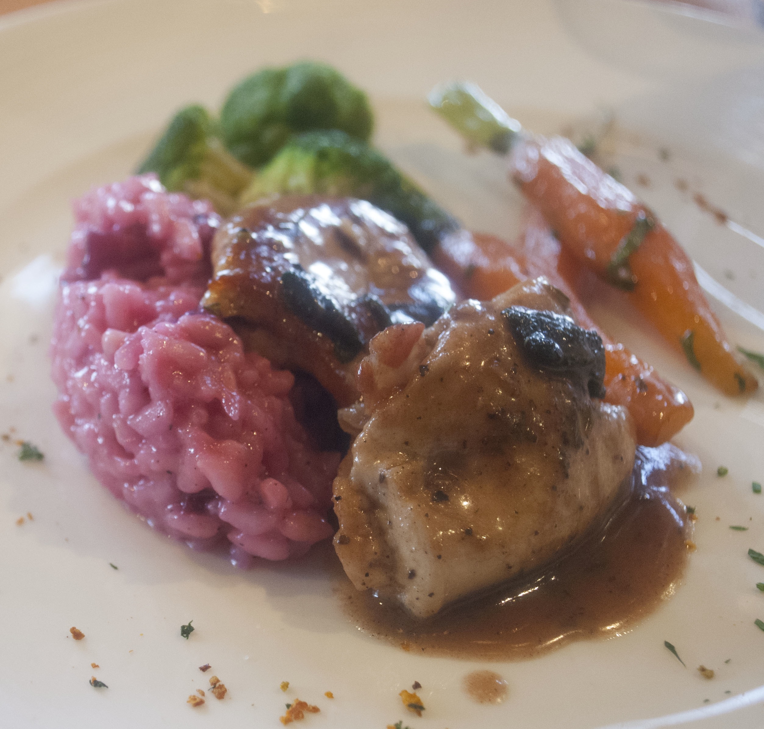 Second course was Saltimbocca di Pollo (Chicken with prosciutto and sage, cooked in Marsala), beet risotto, and baby carrots with cilantro, paired with Fratelli Sangiovese.
