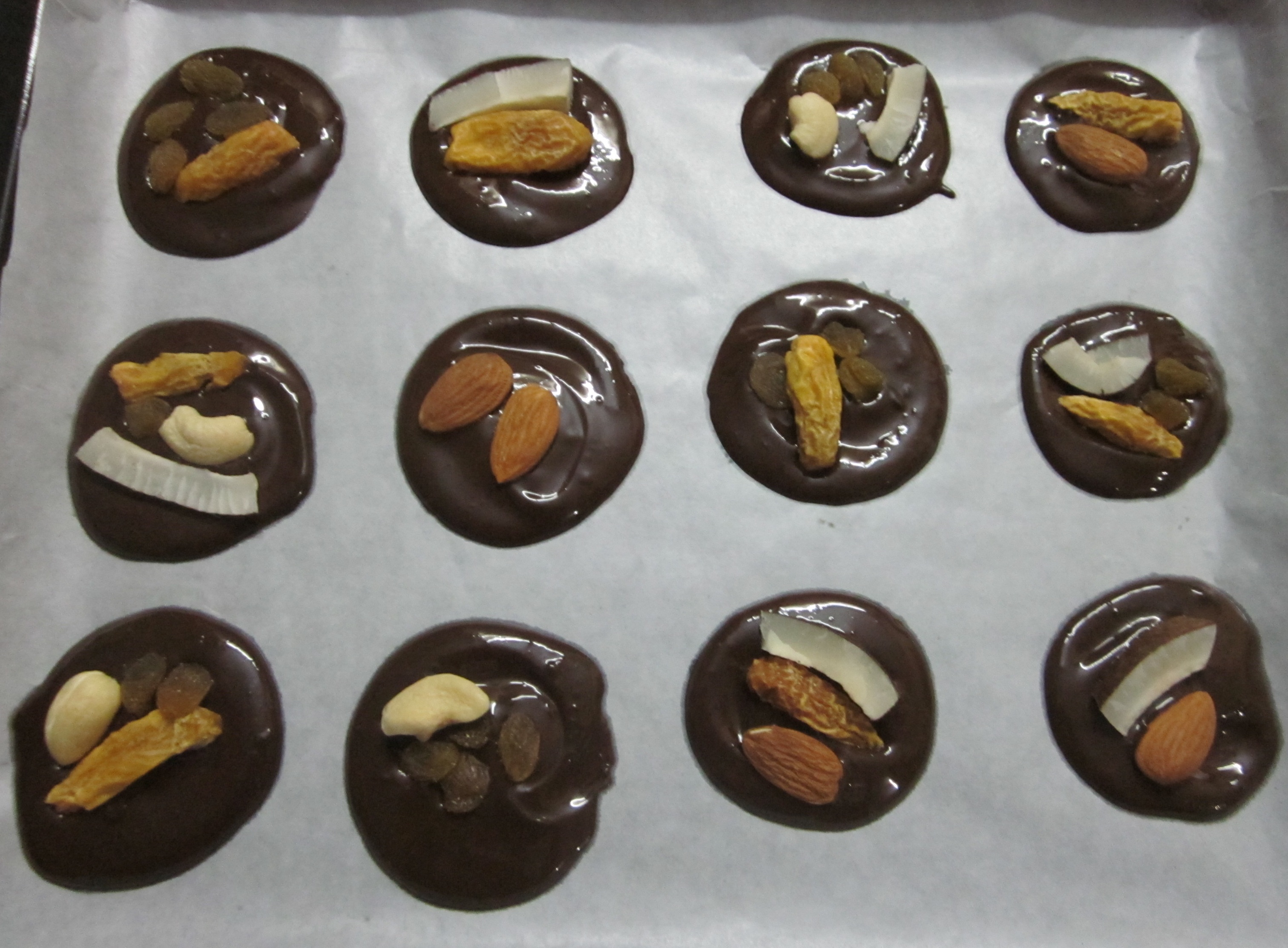 2. Using a tablespoon, scoop out melted chocolate and create small circles on the paper, flattening gently as you go. Add a mix of dried fruits and nuts over the circles and leave to set in the fridge for about 30 minutes. Remove gently from the paper and eat, or store in a sealed container in the fridge.