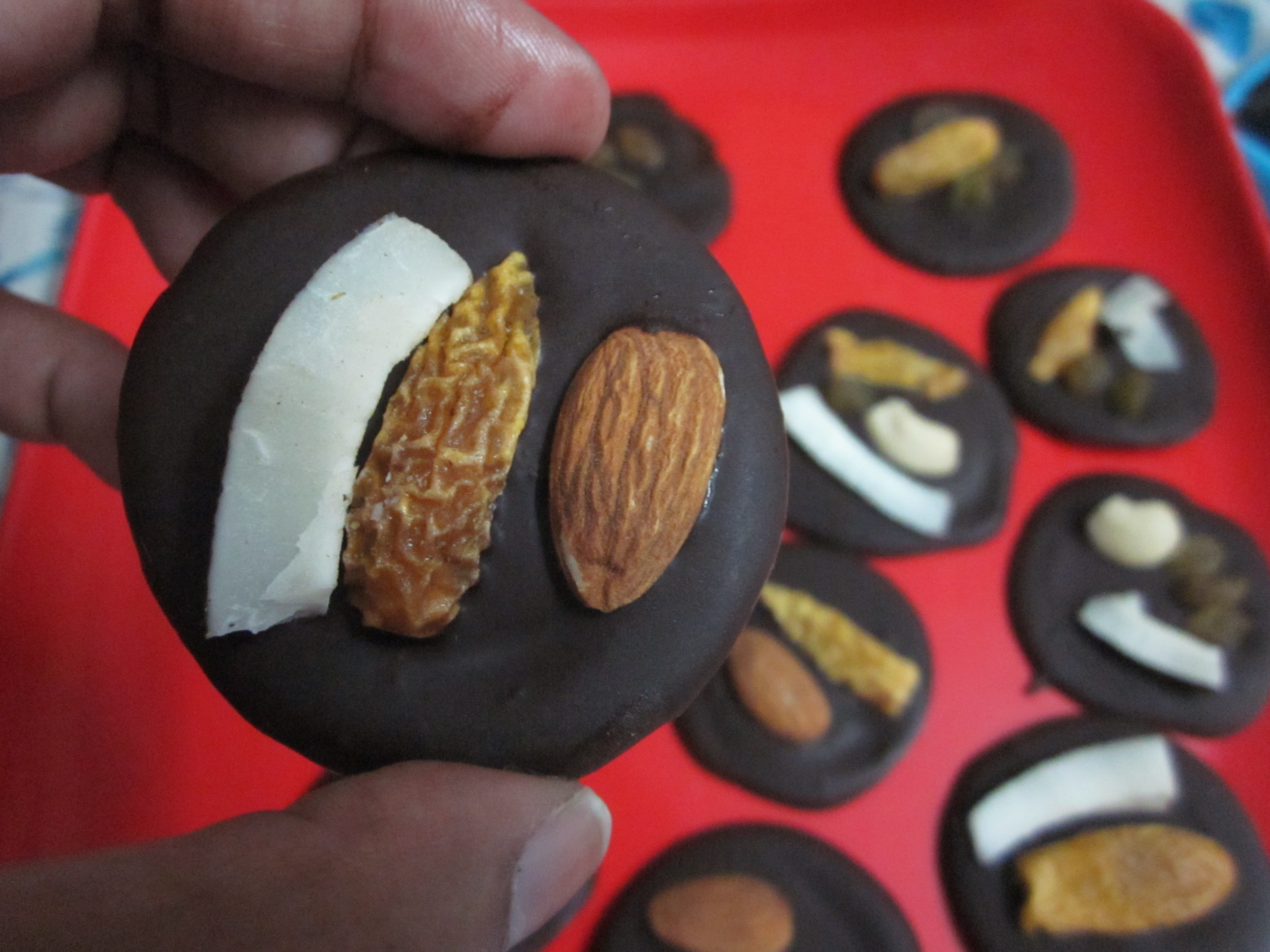 You can experiment with what you want to put on the discs – I did coconut, almonds, cashews, prunes and raisins.