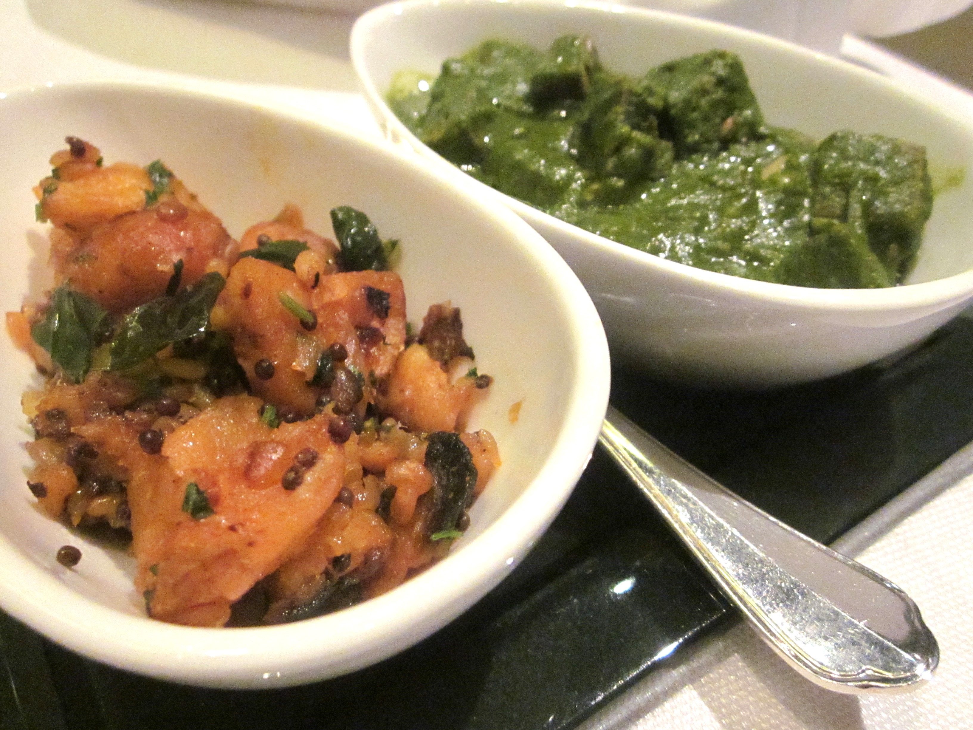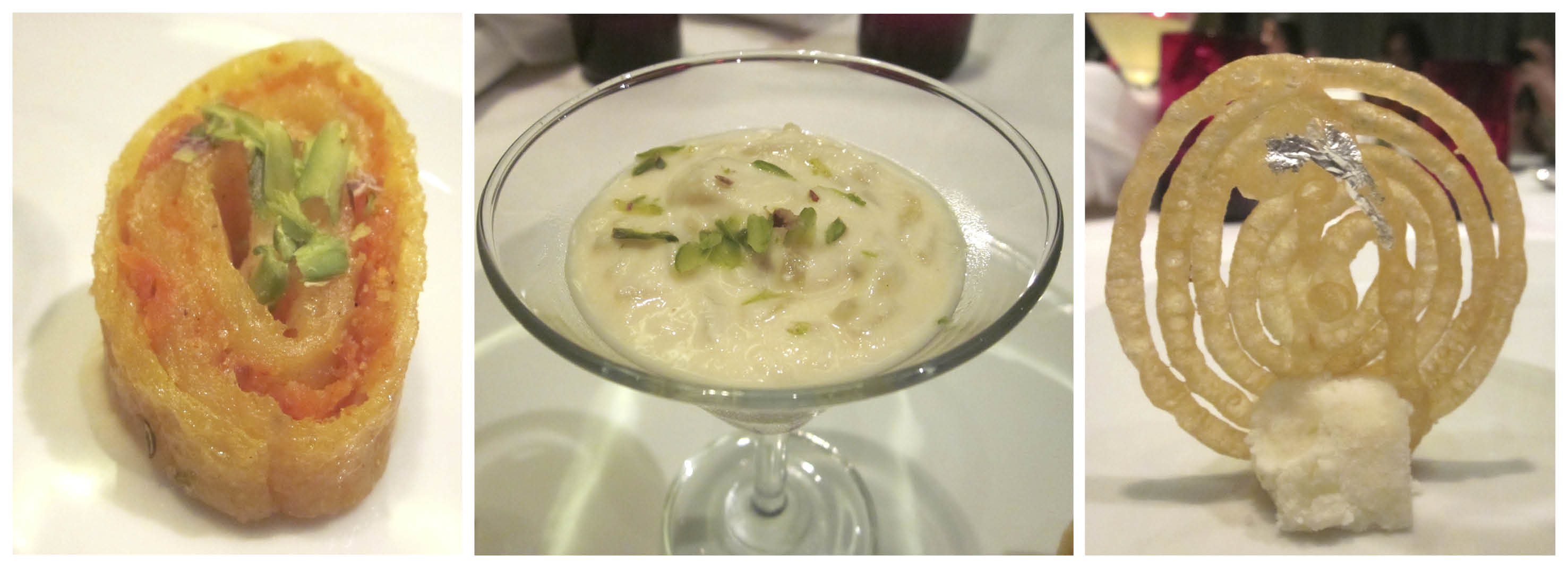 The dessert was another trio: khaas malpua, apple kheer, and jalebi. The unusual apple kheer was delicately sweet, and the gravity-defying jalebi was sticky and very crisp.