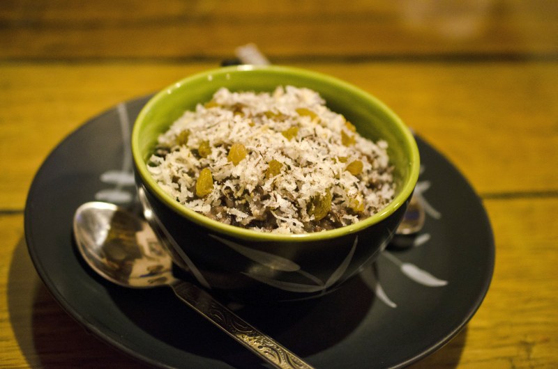 Wild red rice dessert: A creamy rice, coconut, and honey dessert. It’s studded with raisins and has a very underplayed sweetness about it.