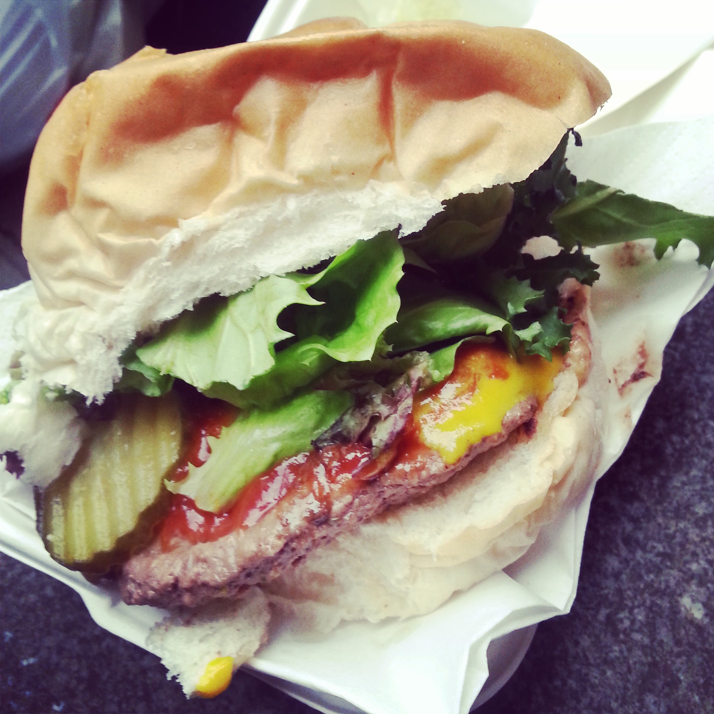 73. Good ‘ol beef burger. With pickles, tomato sauce, mustard, and greens.