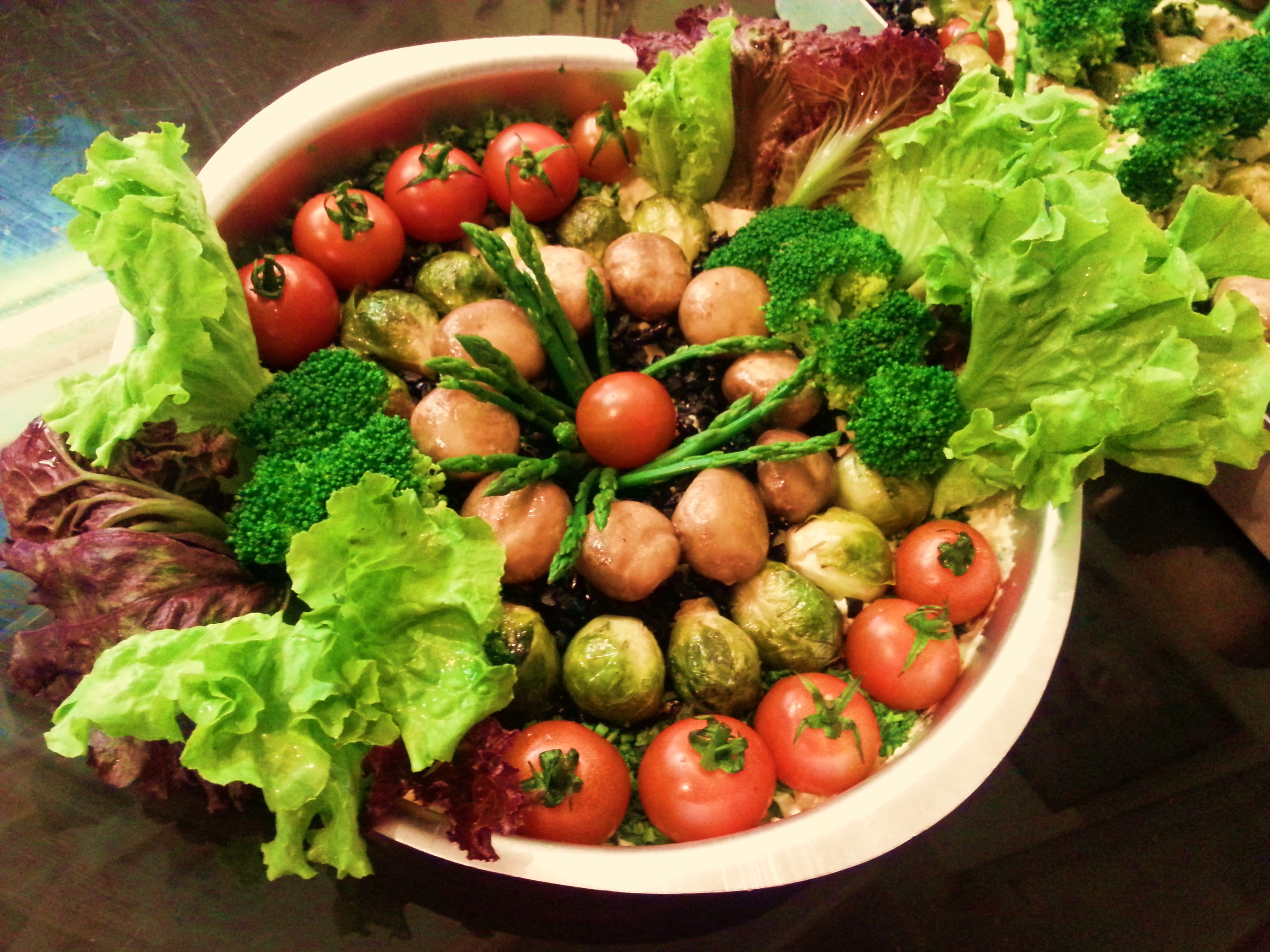 It is a garden of colourful, delicious veggies, on a bed of creamy egg-mayo mix, topped with black olive “soil” and rocket leaf “grass”.