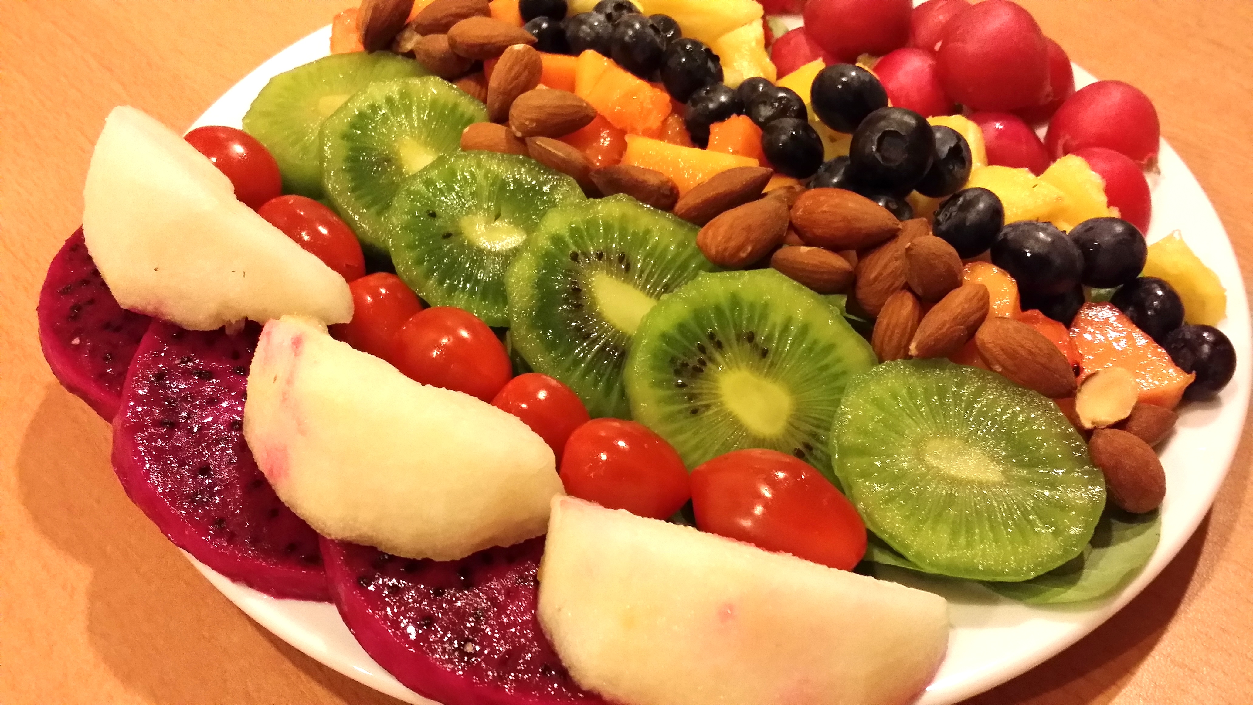 1. Wash and drain the spinach, then arrange evenly on a plate. Cover with all the fruits/veggies-you can use whatever type you like. Just make them a nice mix of colours.